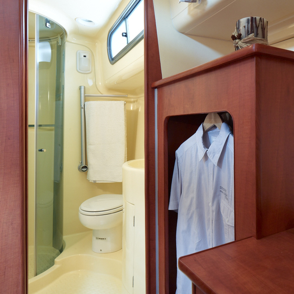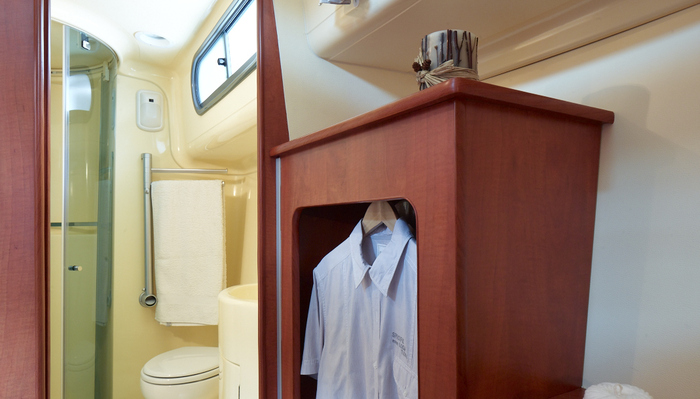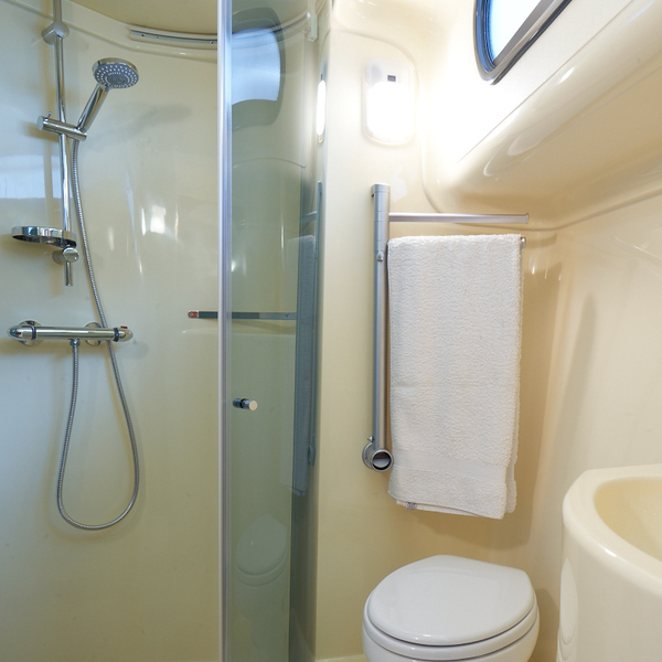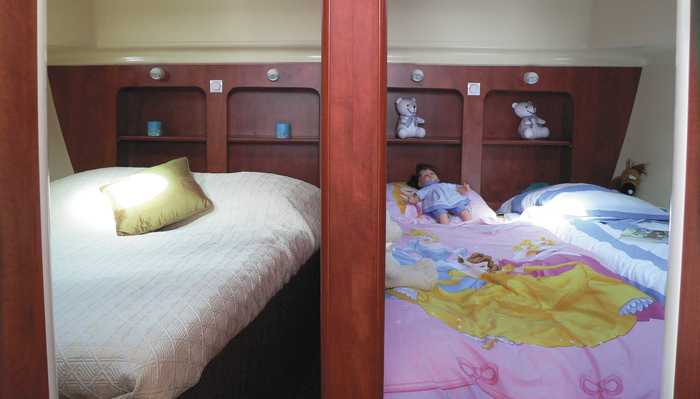 It has 2 spacious cabins at the bow of the boat, one with a double bed, the other with 2 singles, convertible to a double. The living area can also be converted to a double bed.