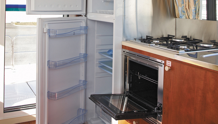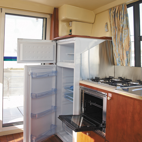 The kitchen offers a large fridge, 4 burner hob and oven whilst there is also a radio/CD/MP3 player, DVD player and connectivity to shore power supply of 220 volts. There is also plenty of storage space onboard.